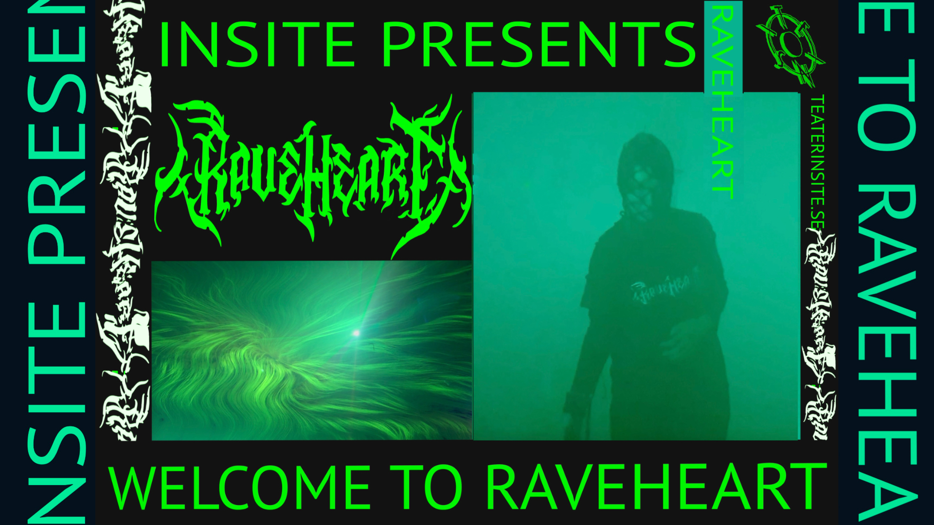Teater InSite har utgått från ravekulturens uttryck och Carl Jungs tankar om arketyper och det kollektiva omedvetna, för att utforska hur gemenskap kan kännas när ljudet påverkar kroppen och får människor att röra sig tillsammans. Den här resan har lett fram till en interaktiv och rumslig performanceinstallation: Raveheart.