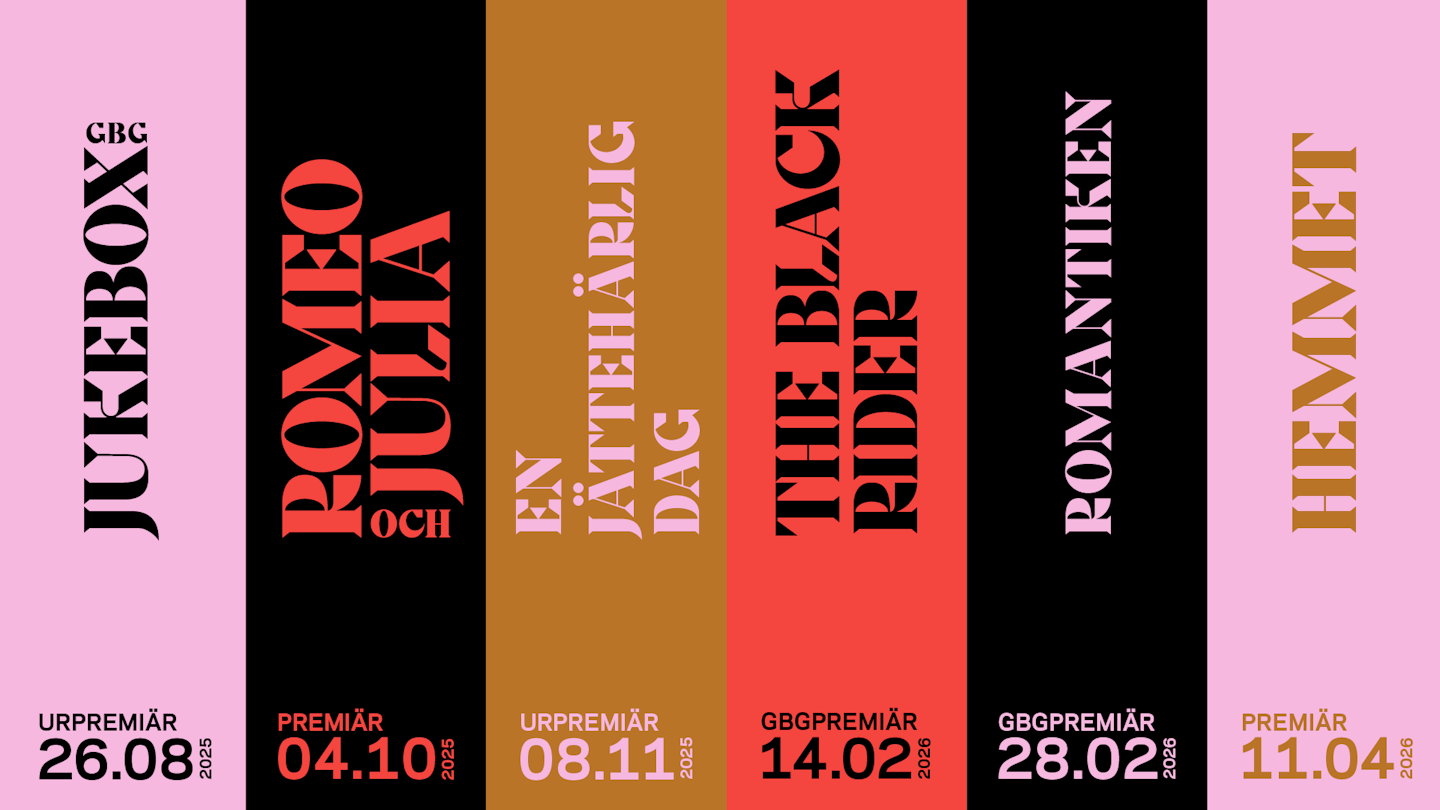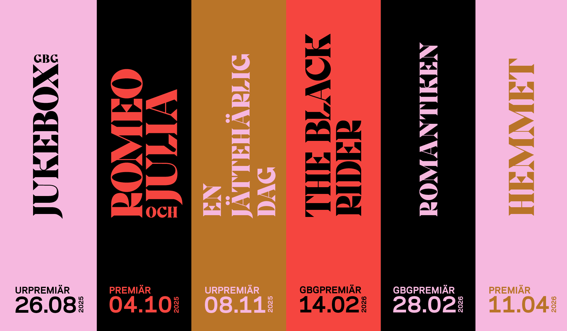 På Folkteaterns scener 25/26 borrar vi ned oss i den våldsamma men odödliga historien om världens mest kända kärlekspar, den om Romeo och Julia, här som en maxad sing a long-session att förlora sig själv i. Vi låter franska och svenska scenkonstnärer tjuvlyssna på göteborgarna, gestalta orden som omger dem och sen låta publiken välja vilka de vill se i sin alldeles egna Jukebox Gbg. Vi frontar kvinnlig vänskap och ger dig presenten som bara fortsätter att öppnas i En jättehärlig dag. Vi besöker Hemmet och revolutionärerna som nu är i samhällets periferi. Och så gör vi en pakt med djävulen i det storslagna musikverket The Black Rider som tar dig genom mörker, begär och fördärv. Köttets lust, livets förgänglighet och längtan efter frihet gestaltas av dockor i Romantiken.